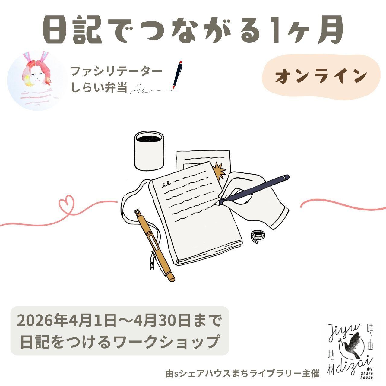 内容は、しらい弁当さんとともに1ヶ月間日記をつけ、互いに読み合うワークショップをオンラインの対話会で行うという流れとなります。